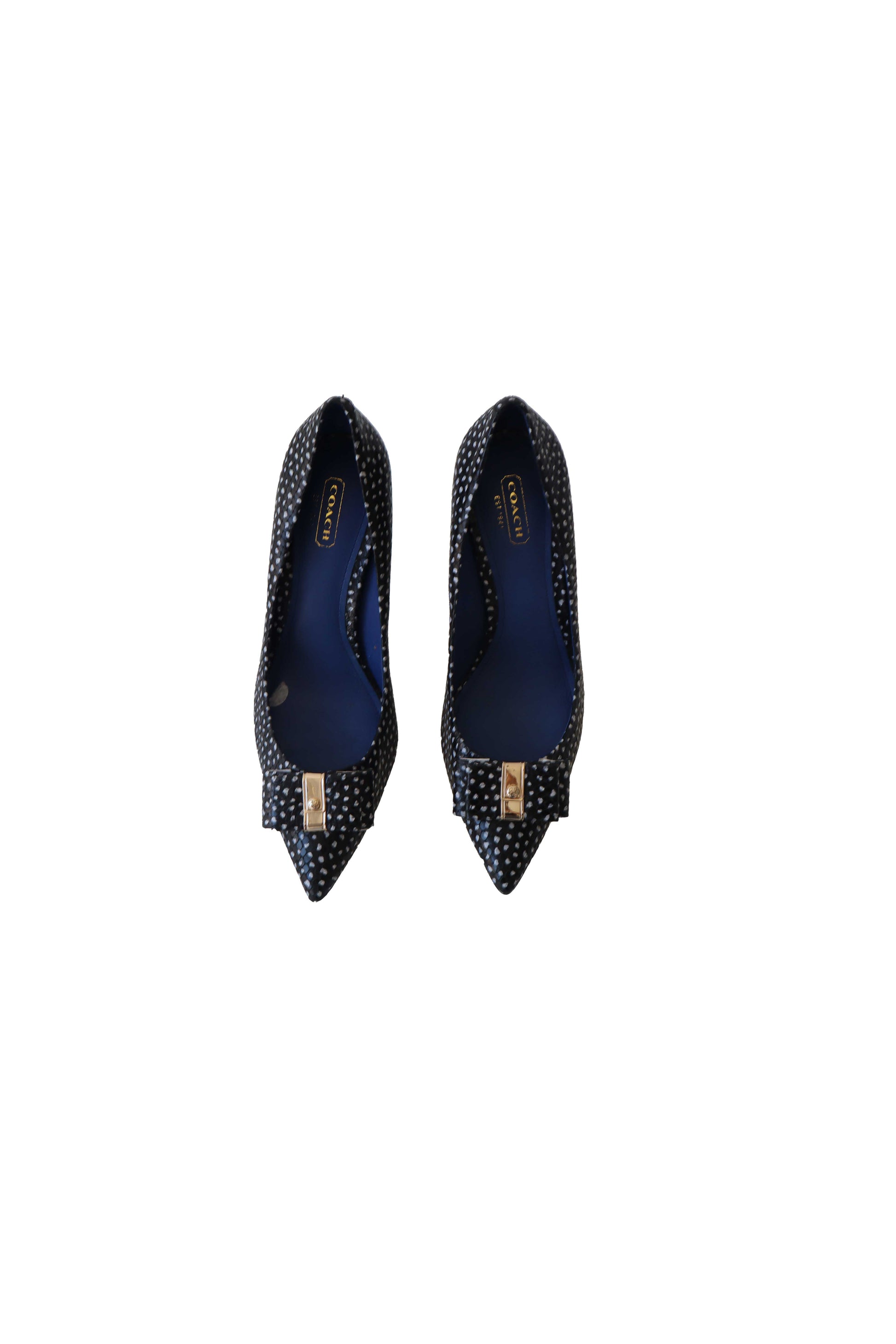 Bu Coach topuklu ayakkabı, markanın klasik-şık çizgisini modern bir dokunuşla birleştiren zarif bir modeldir. Sivri burun formu ayağı daha uzun ve ince gösterirken, lacivert zemin üzerindeki minik desenler modele sofistike bir hareket katar. Ön kısmındaki metal detay, Coach’un imza estetiğini vurgulayarak ayakkabıya feminen ama güçlü bir karakter kazandırır. Orta-yüksek topuk boyu sayesinde hem ofis şıklığında hem de akşam davetlerinde rahatlıkla tercih edilebilecek, zamansız ve çok yönlü bir tasarımdır.