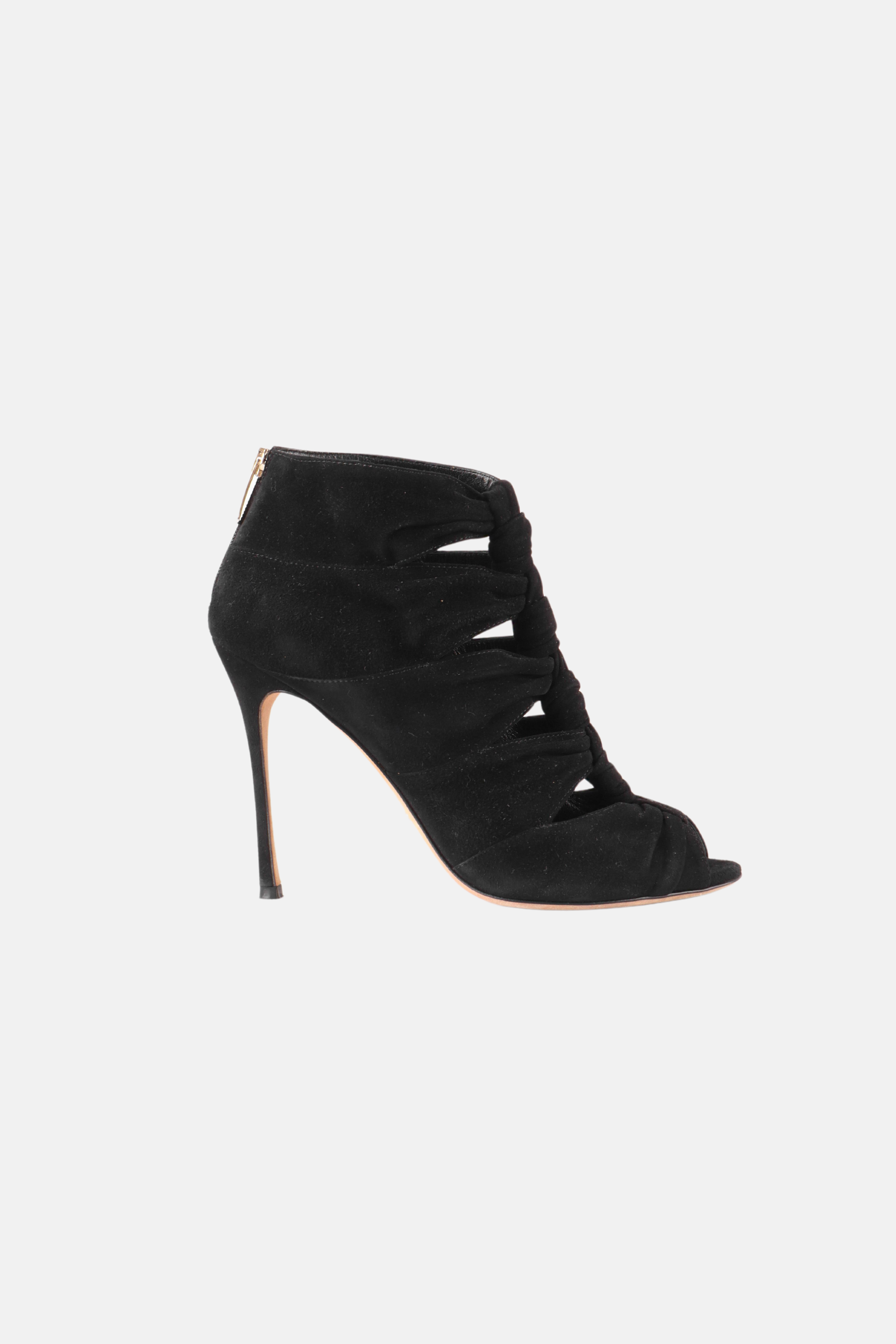 Editör Notları: Siyah süet dokusuyla şık bir görünüm sunan bu açık burunlu kısa bot, yanlardaki kıvrımlı kesimleriyle modern ve feminen bir hava taşıyor.