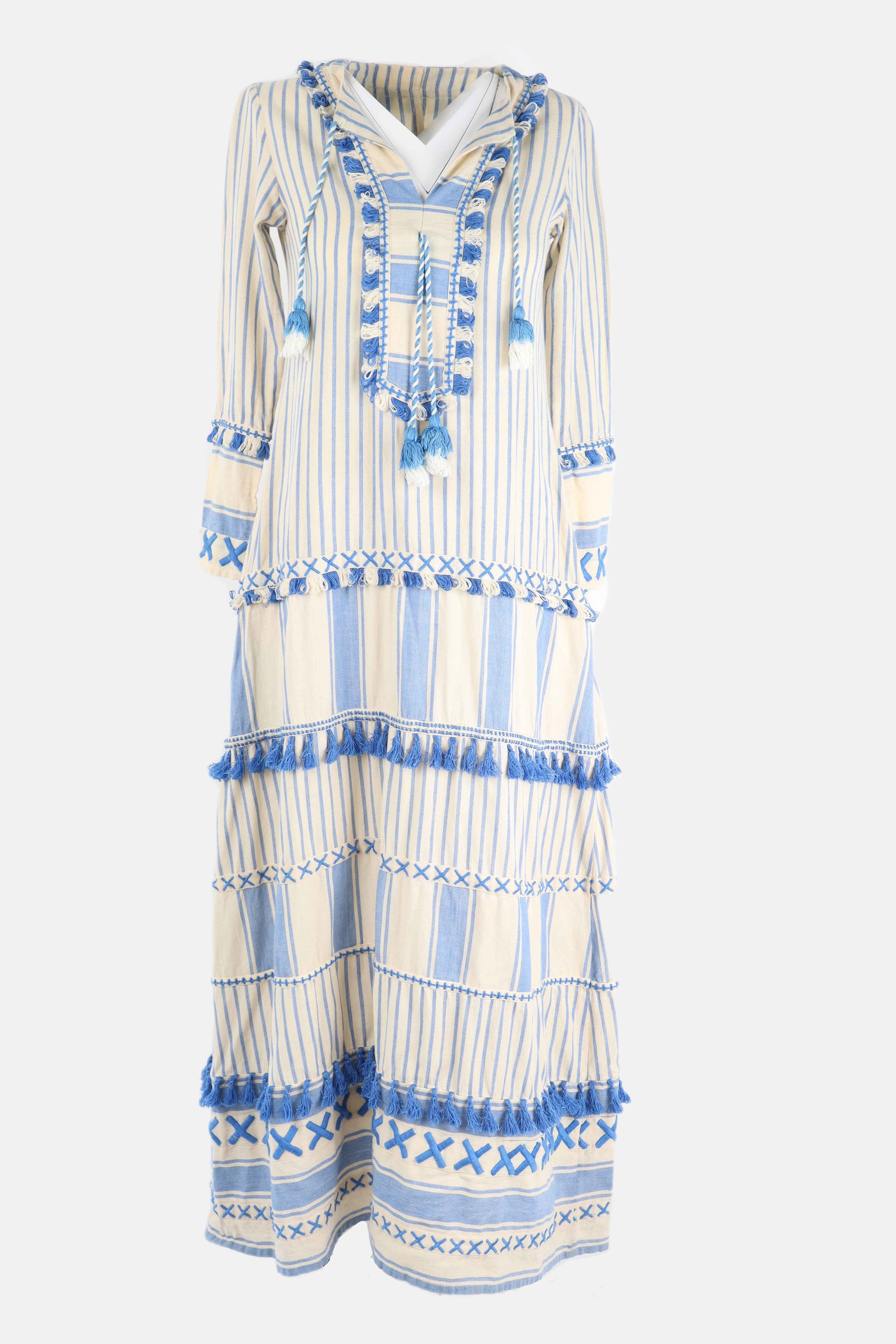 - Editör Notları:Mavi ve krem tonlarının uyumuyla öne çıkan bu elbise, dokuma şeritleri ve püskül detaylarıyla ferah ve karakterli bir görünüm sunuyor. Yumuşak dokusu ve rahat kesimi sayesinde hareket alanı geniş, konforlu bir form oluşturuyor.Uzun kol yapısı ve akışkan eteğiyle hem gündelik yaşamda hem de tatil stilinde rahatlıkla kullanılabilir. Hafif bohem etkili tasarımı, şehir içinde de plaj sonrası akşam yürüyüşlerinde de uyum sağlayan çok yönlü bir parça. Gün boyunca konforu korurken şık bir duruş elde etmek isteyenler için ideal bir seçim.