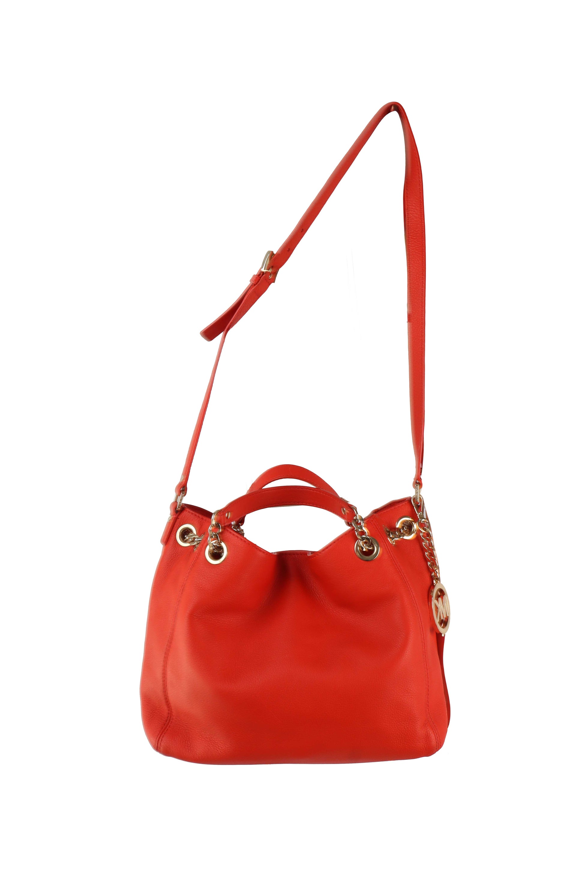 Bu çanta, markanın şehirli ve fonksiyonel çizgisini yansıtan yumuşak formlu hobo model tasarımlarından biridir. Canlı kırmızı deri gövdesi, altın tonlu metal halkalar ve zincir detaylı askı bağlantıları ile modern bir şıklık sunarken; hem kısa elde taşıma hem de ayarlanabilir uzun askısı sayesinde omuz ve çapraz kullanım imkânı verir. Günlük kullanıma uygun geniş iç hacmiyle konforlu, sade ama dikkat çekici tarzıyla ofisten hafta sonu kombinlerine kadar kolayca uyarlanabilen zamansız bir Michael Kors modelidir.
