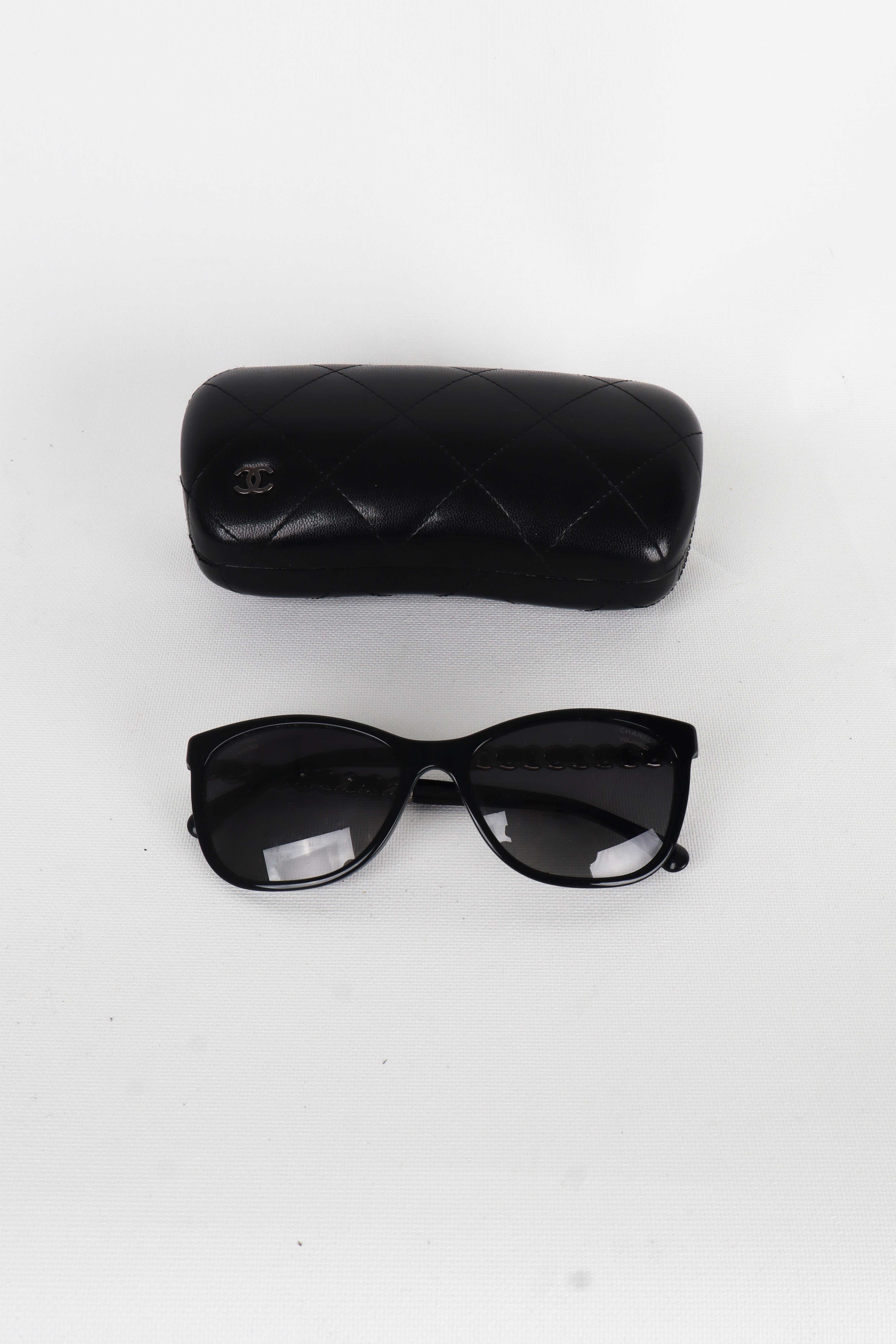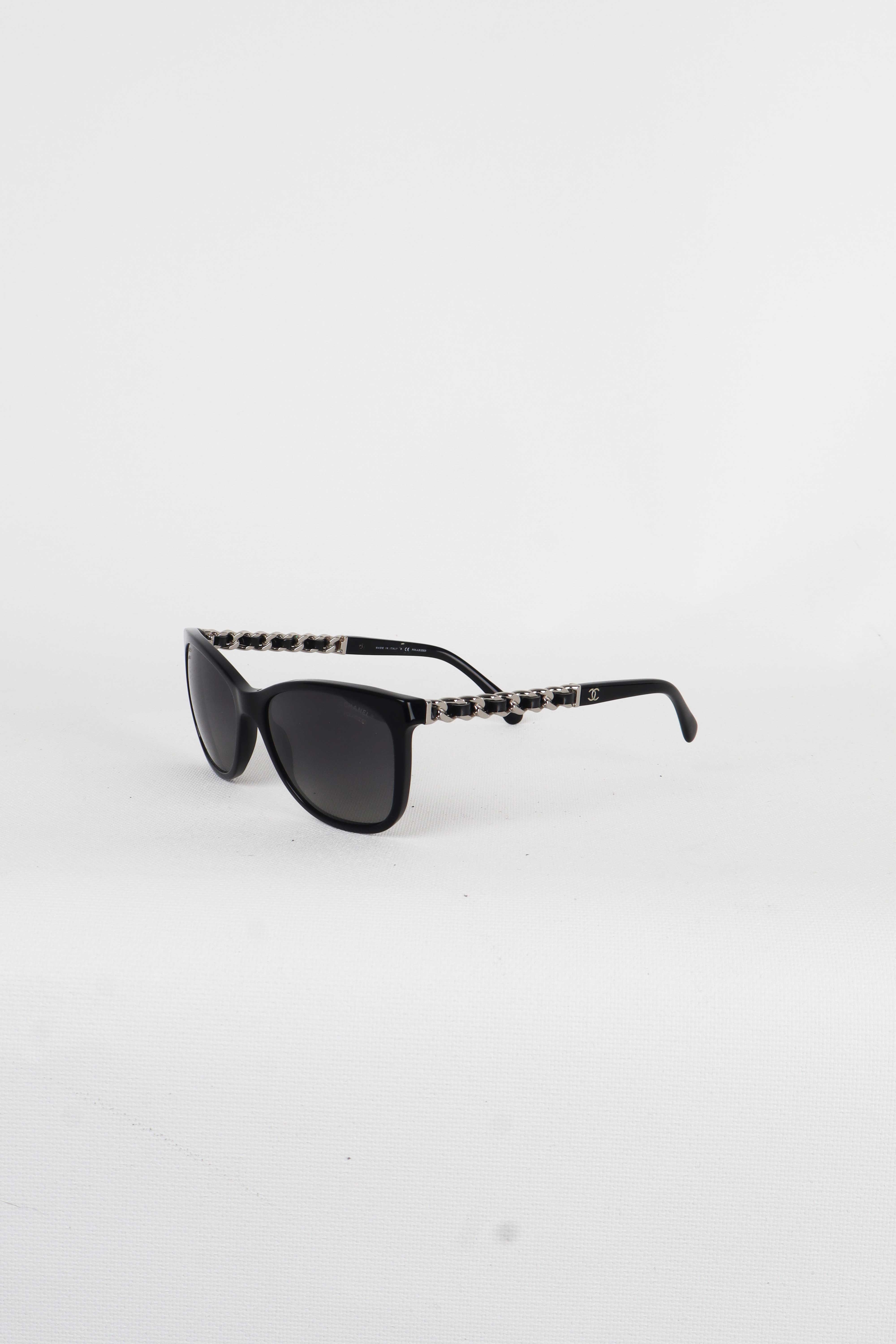 - Sapları gümüş zincir ve logo detaylı güneş gözlüğü,