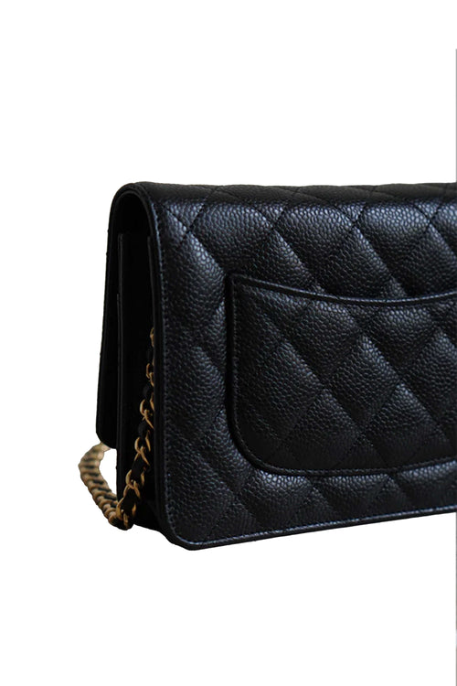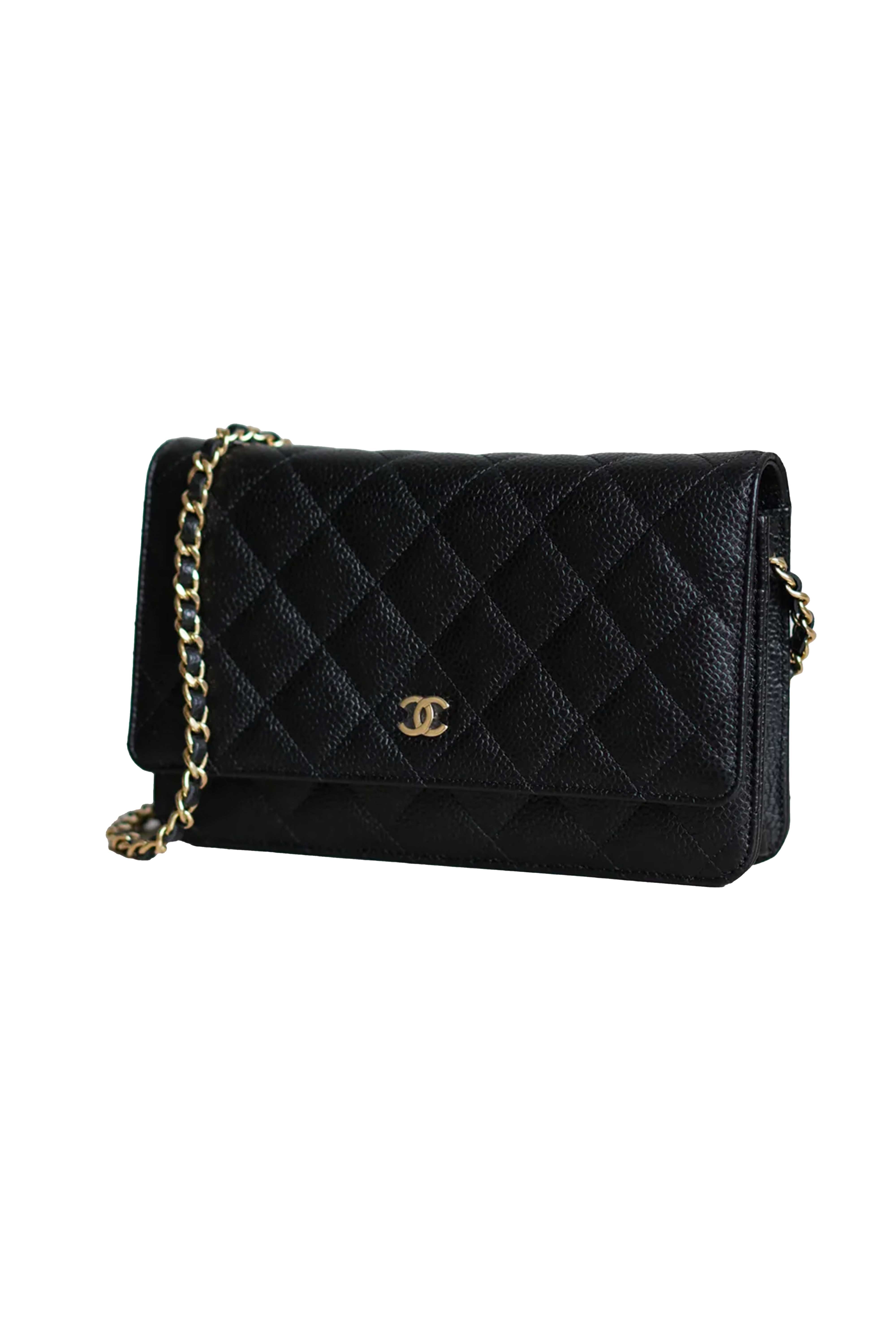 Bu Chanel Wallet on Chain (WOC), markanın ikonik Classic WOC modelidir. Siyah caviar deri, elmas kapitone dokusu ve altın tonlu CC logosuyla Chanel’in zamansız zarafetini yansıtır. İnce zincir askısı sayesinde hem omuzda hem çapraz kullanılabilen bu kompakt model; kart bölmeleri ve fermuarlı iç yapısıyla günlük essentials’ları rahatça taşımaya uygundur. Gündüzden geceye geçişlerde şıklığını koruyan, Chanel koleksiyonlarının en fonksiyonel ve en çok tercih edilen parçalarından biridir.