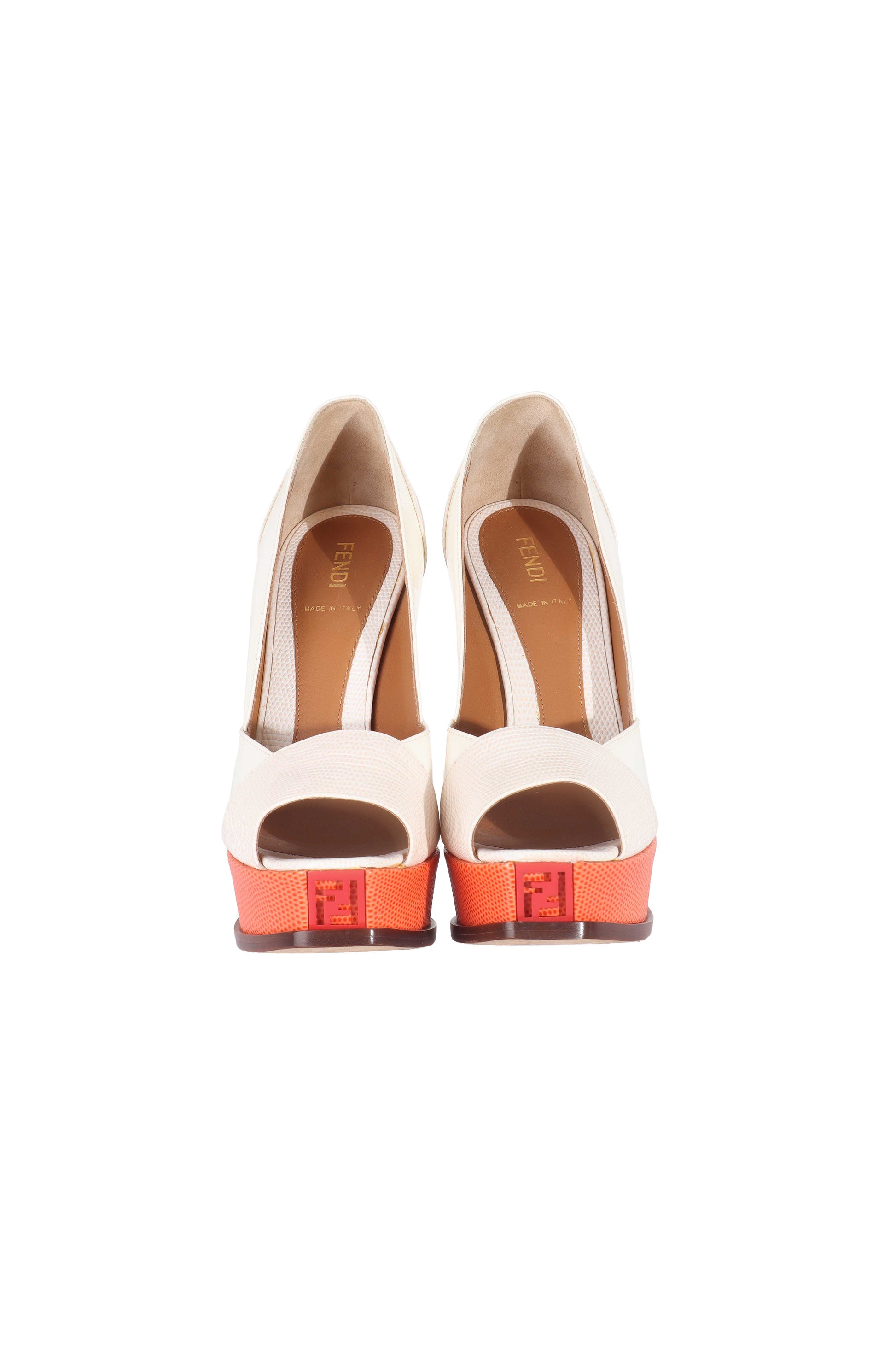 Bu Fendi “Fendista” topuklu ayakkabı, markanın güçlü logo dili ve feminen siluetini bir araya getiren ikonik platform modellerinden biridir. Açık krem tonlu üst yüzeyi, kontrast yaratan mercan-turuncu platform ve topuk detayıyla dinamik bir görünüm sunarken, önde yer alan FF logo plakası tasarıma imza niteliği kazandırır. Açık burunlu (peep-toe) formu ve yüksek platformu sayesinde hem iddialı hem de dengeli bir duruş sağlar. Özel davetler, yaz akşamları ve şık gece kombinleri için dikkat çekici ve koleksiyonluk bir Fendi modelidir.