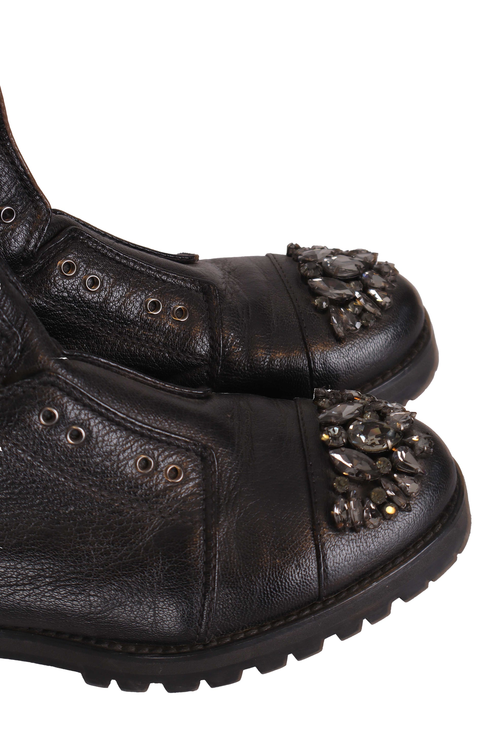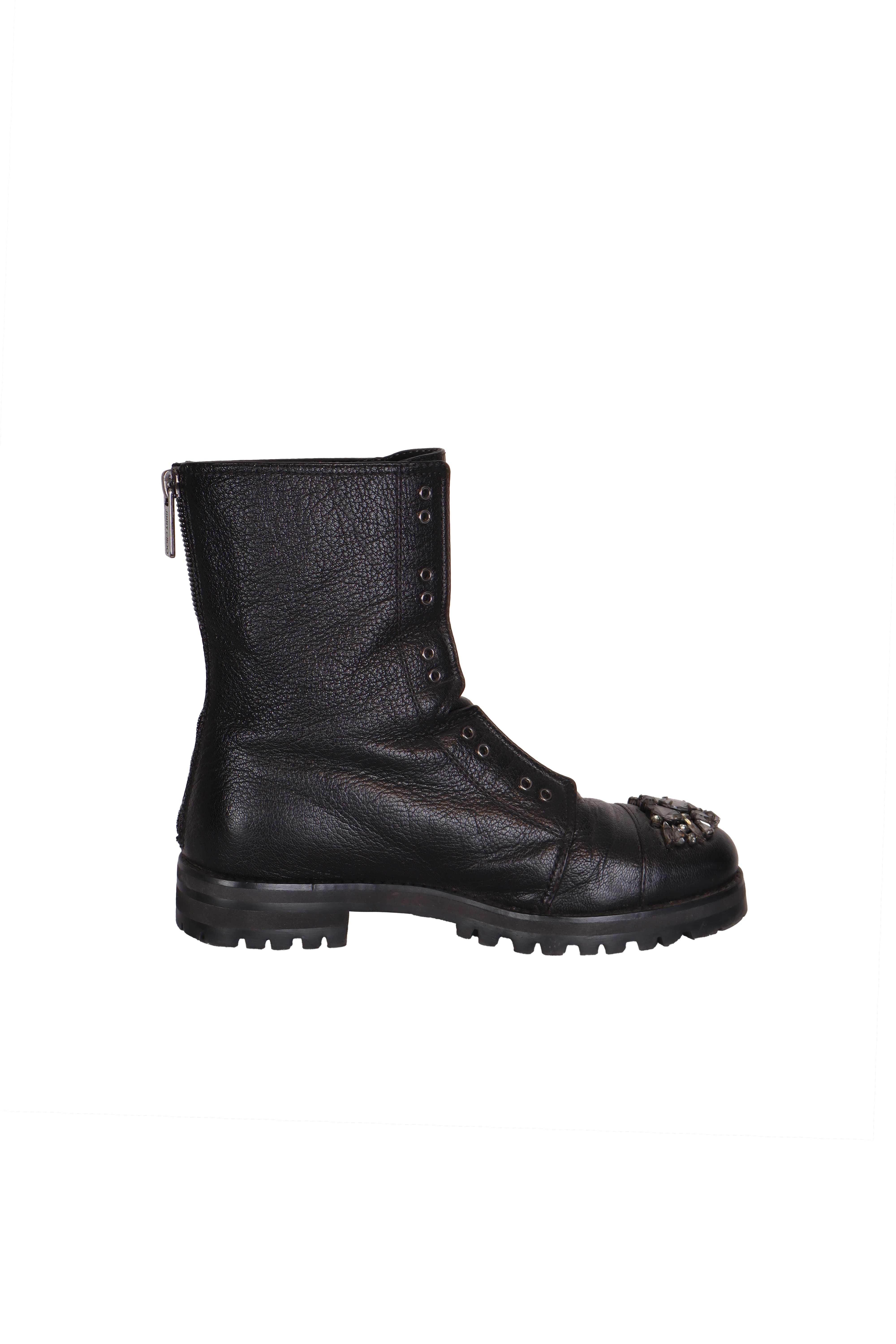 Bu Jimmy Choo bot, markanın feminen dokunuşu güçlü detaylarla buluşturan karakteristik tasarım anlayışını yansıtan, kristal taş süslemeli bilek boy combat-style bir modeldir. Yumuşak siyah deri gövdesi, önde bağcık detayları ve kalın kauçuk tabanıyla hem konforlu hem iddialı bir siluet sunar. Burun kısmındaki taş aplikeler modele sofistike bir ışıltı katarken, günlük kombinlerden şehir şıklığına kadar rahatlıkla kullanılabilen, modern ve statement bir parçadır.