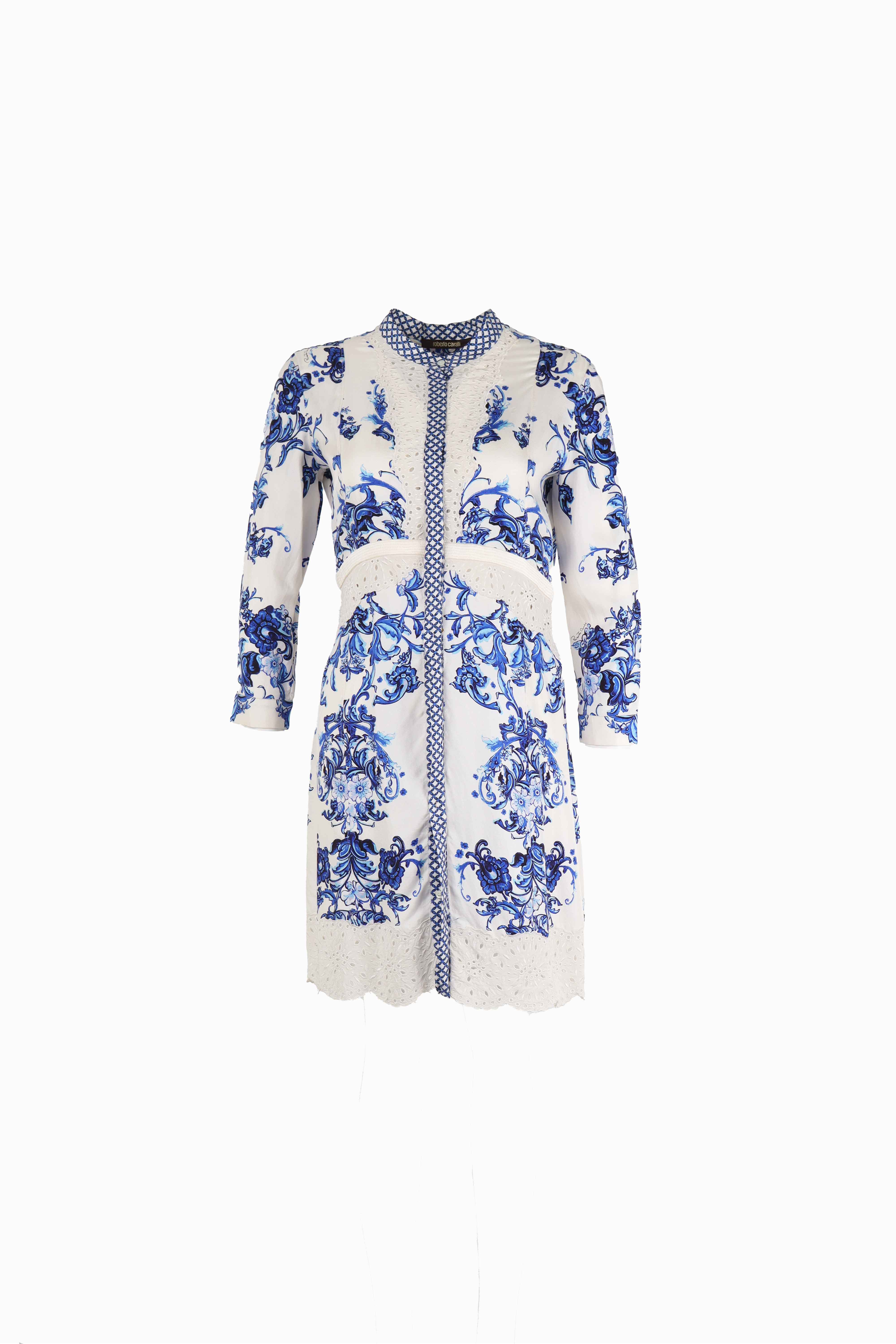 Desenli, dantel detaylı, önden düğmeli Roberto Cavalli elbise, zamansız bir şıklık sağlar.